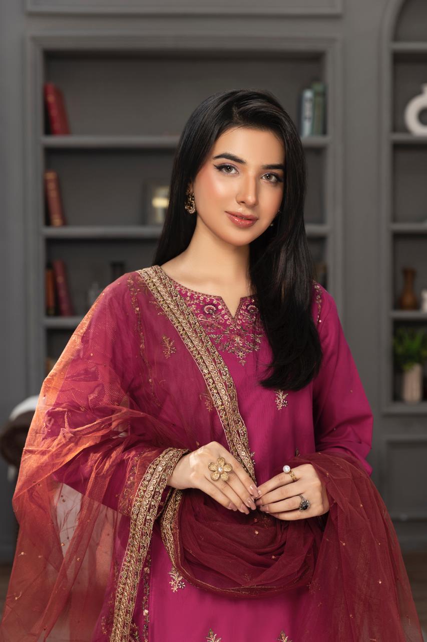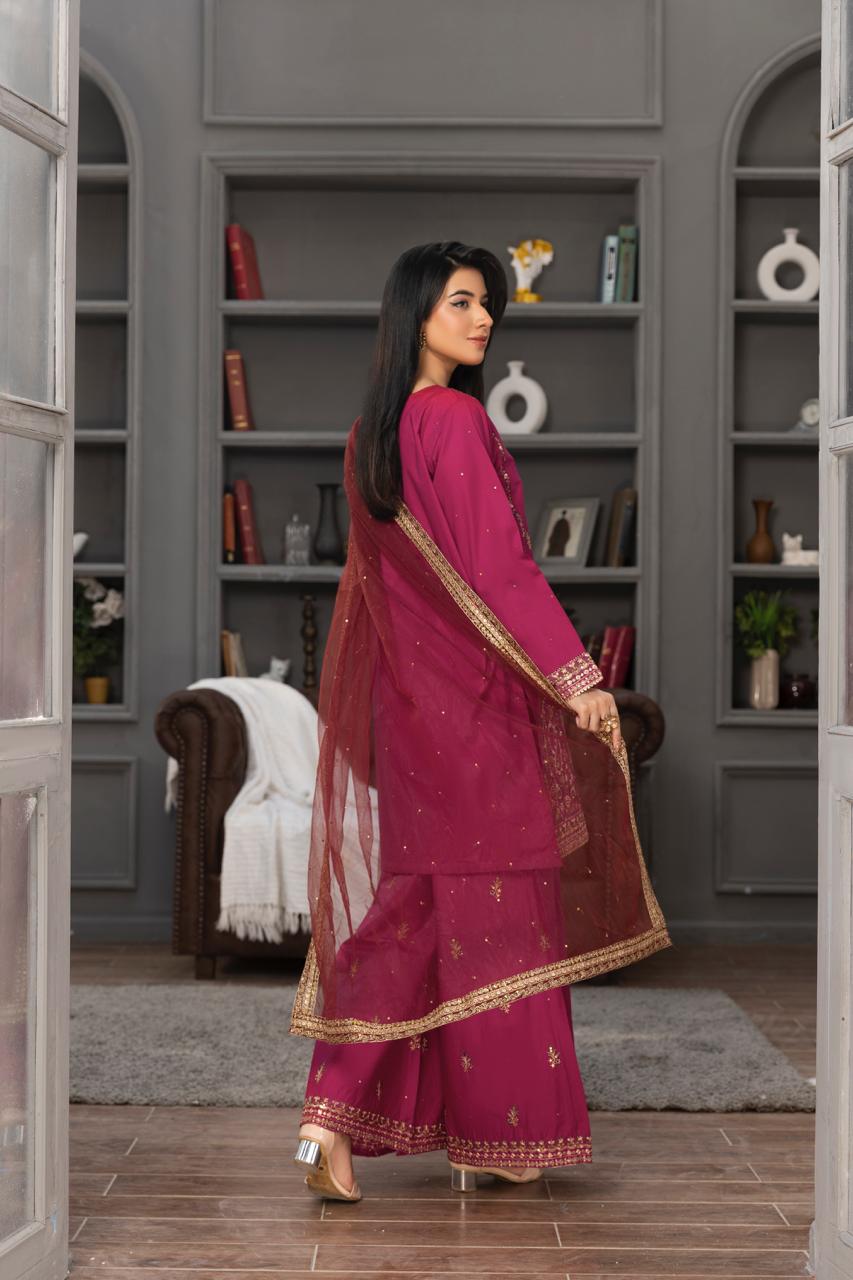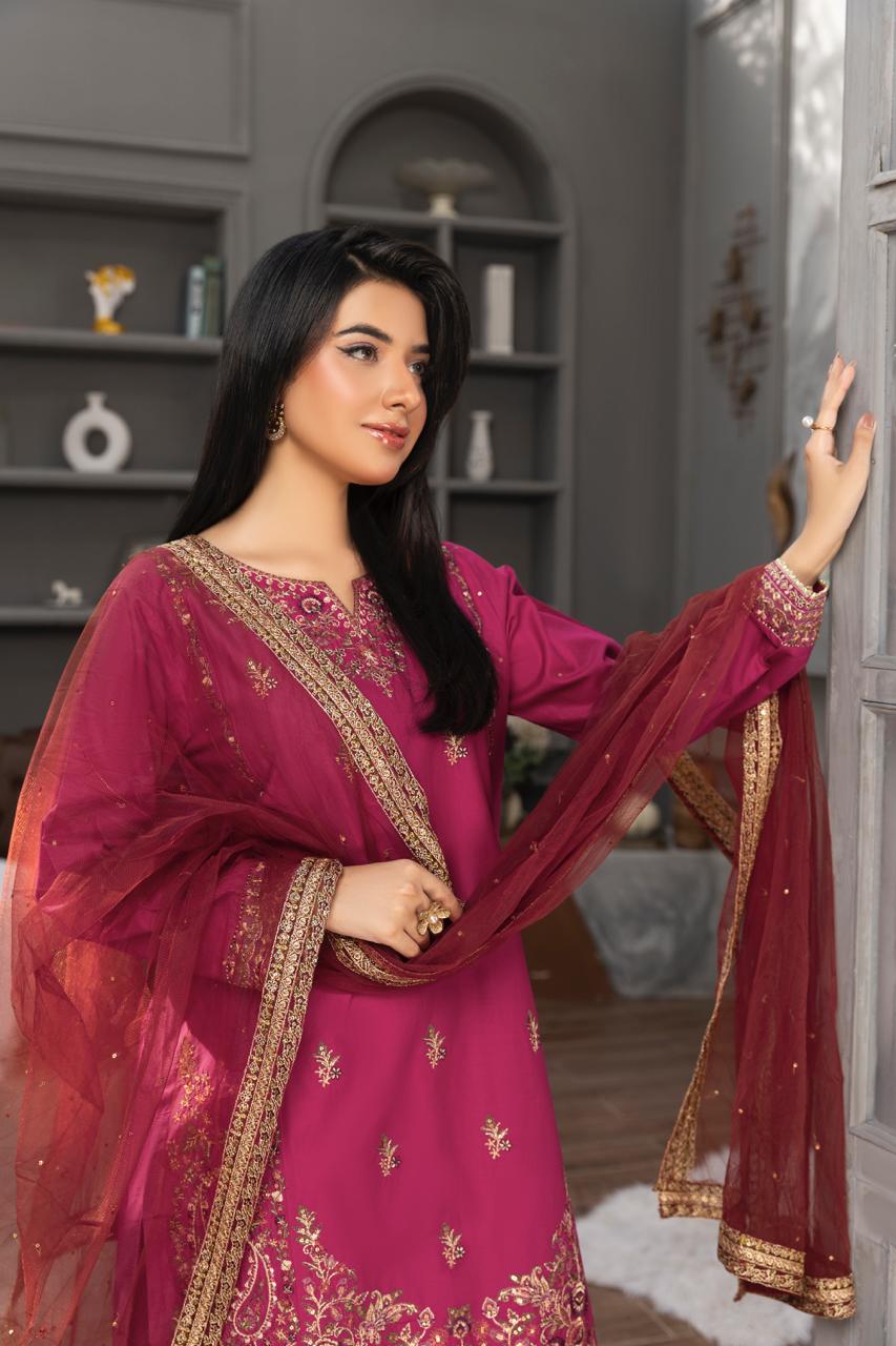 A deep magenta ensemble crafted with intricate golden embroidery, exuding richness and sophistication. Paired with a contrast brown dupatta adorned with a delicate border, this outfit reflects timeless elegance. Perfect for festive evenings and special occasions where grace meets tradition.