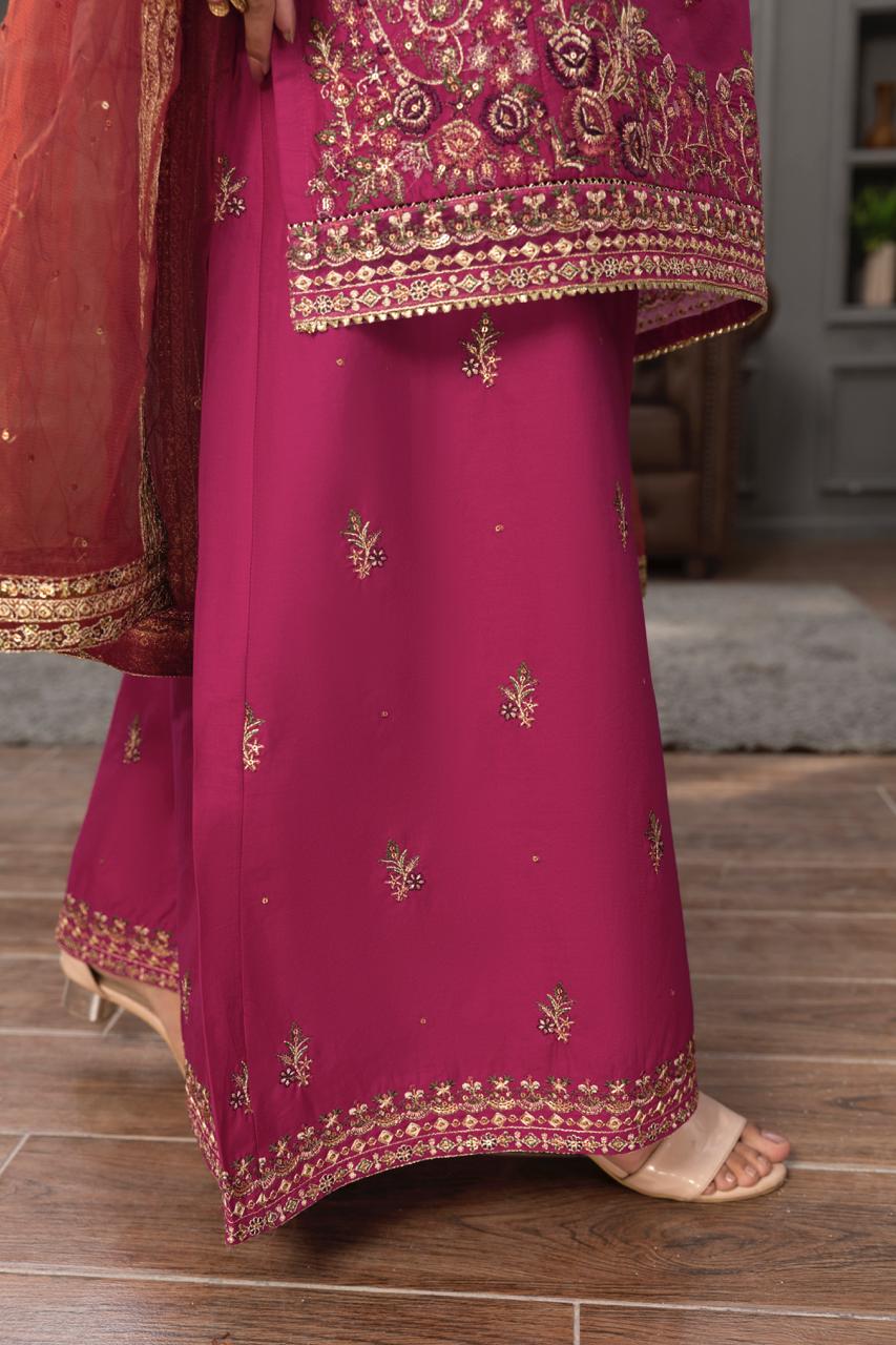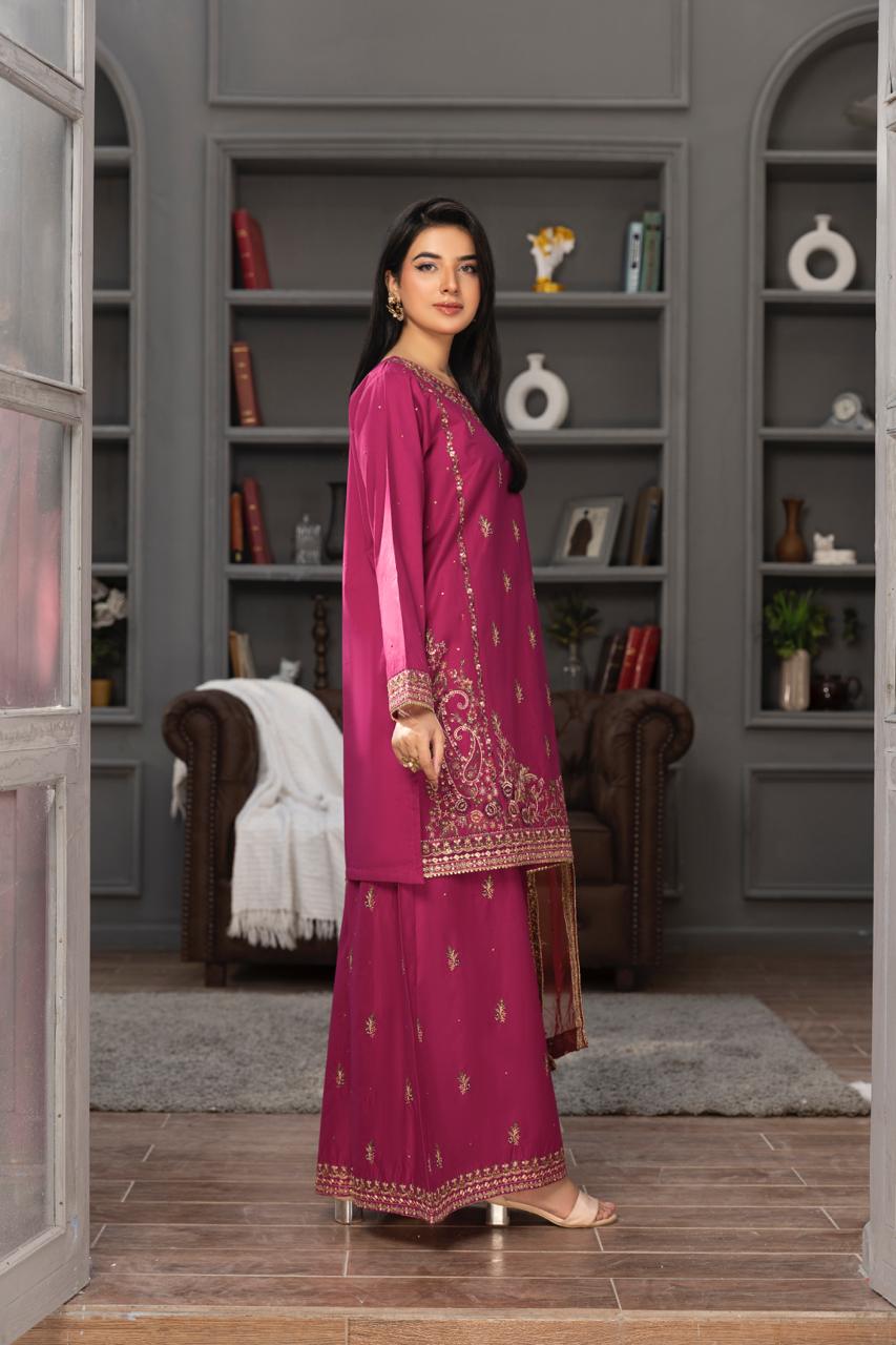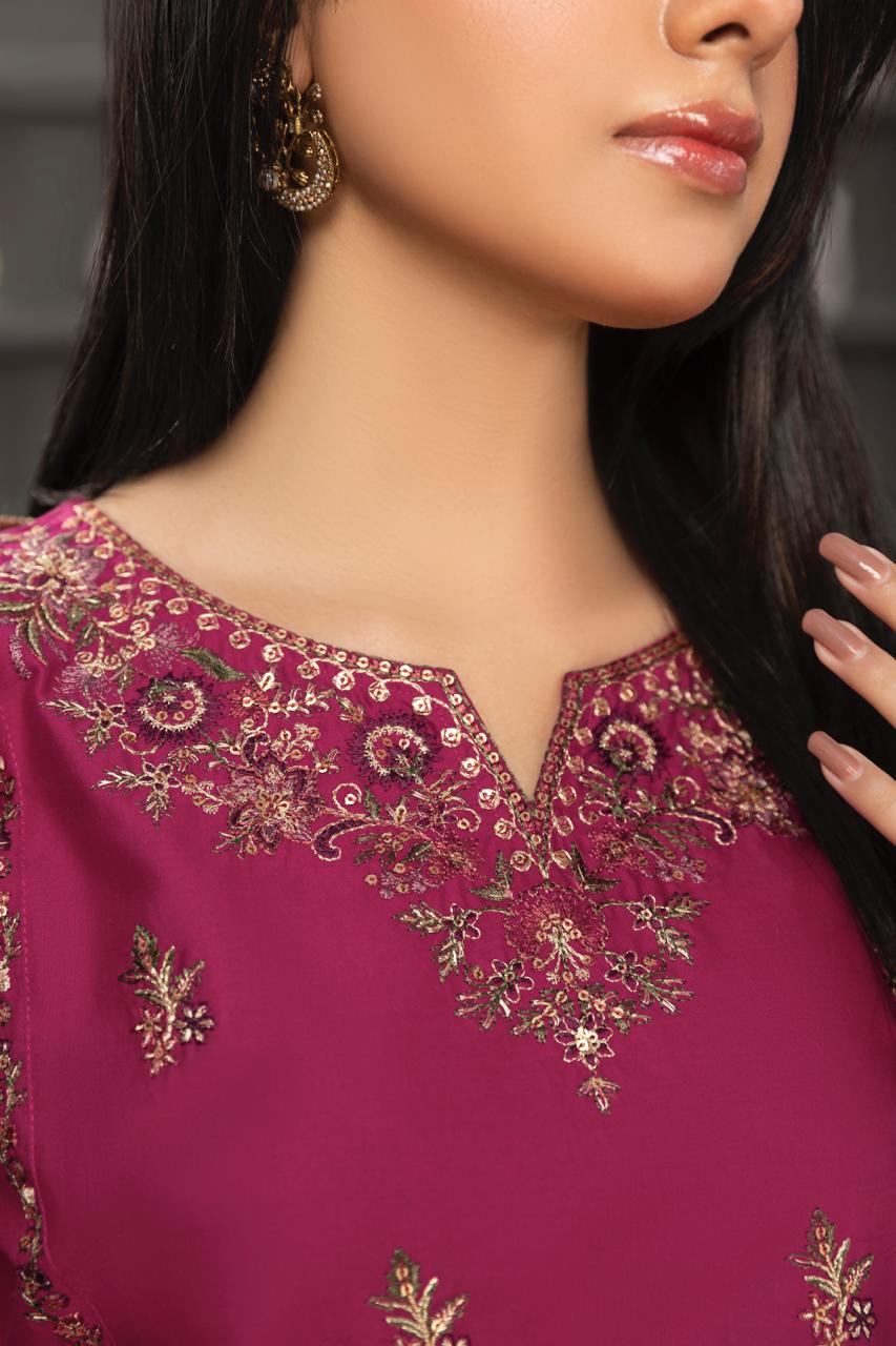 A deep magenta ensemble crafted with intricate golden embroidery, exuding richness and sophistication. Paired with a contrast brown dupatta adorned with a delicate border, this outfit reflects timeless elegance. Perfect for festive evenings and special occasions where grace meets tradition.