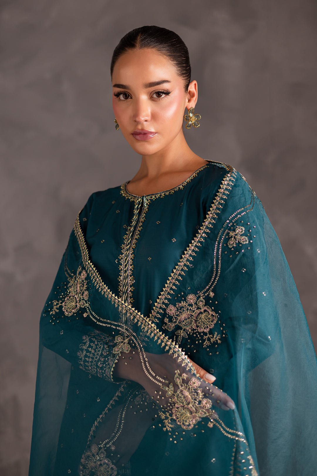 Radiate timeless charm with Mehwar, Crafted with delicate threadwork and intricate embellishments. The kurta is adorned with elegant embroidery along the neckline and sleeves, complemented by an ethereal net dupatta featuring dainty accents. Paired with matching trousers, this outfit beautifully blends festive grace with modern sophistication — perfect for weddings, soirées, and special gatherings. 🌟