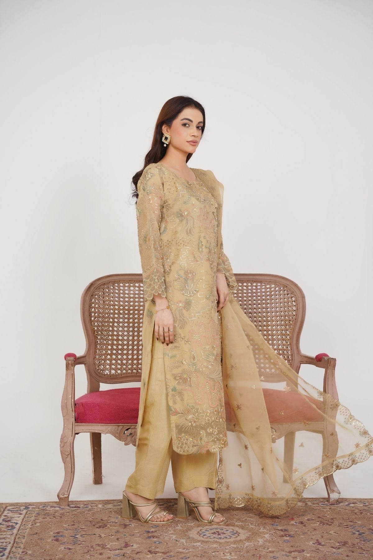 Noor-e-Jahan is an elegant three-piece South Asian formal suit in a sophisticated, muted gold or antique beige hue. The shirt is embellished fabric like organza, featuring intricate heavy threadwork and sequin detailing that subtly incorporates soft, multi-colored accents like pale pink and green. It features full sleeves with scalloped cuffs. The look is completed with matching, simple trousers and a  dupatta  with coordinated detailing. This opulent and classic attire is perfectly suited for your festive edition.