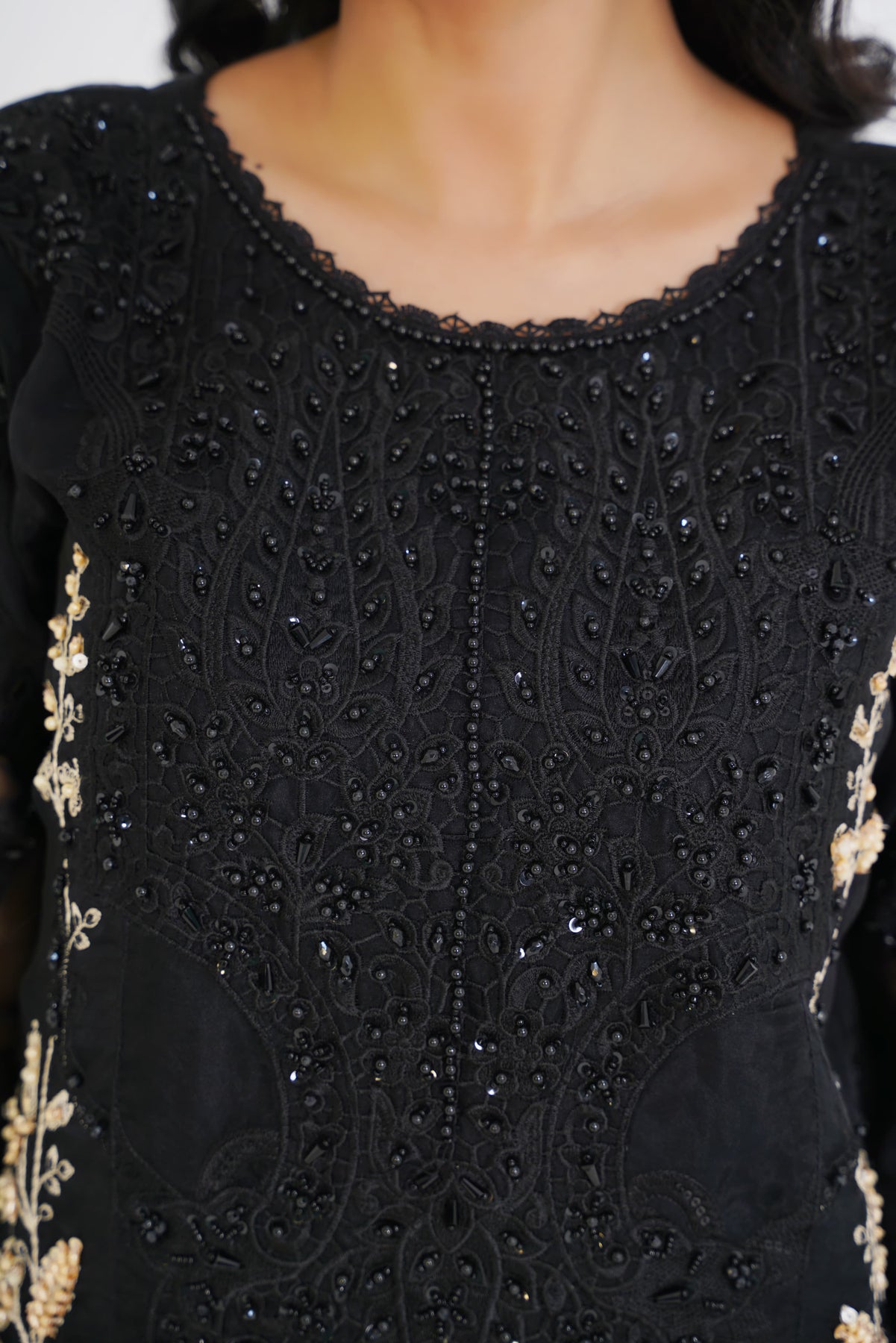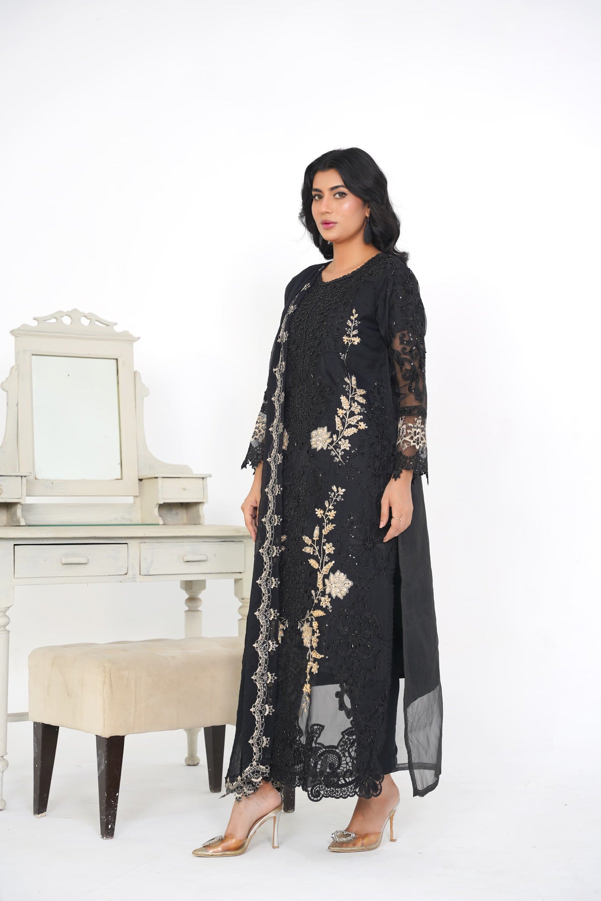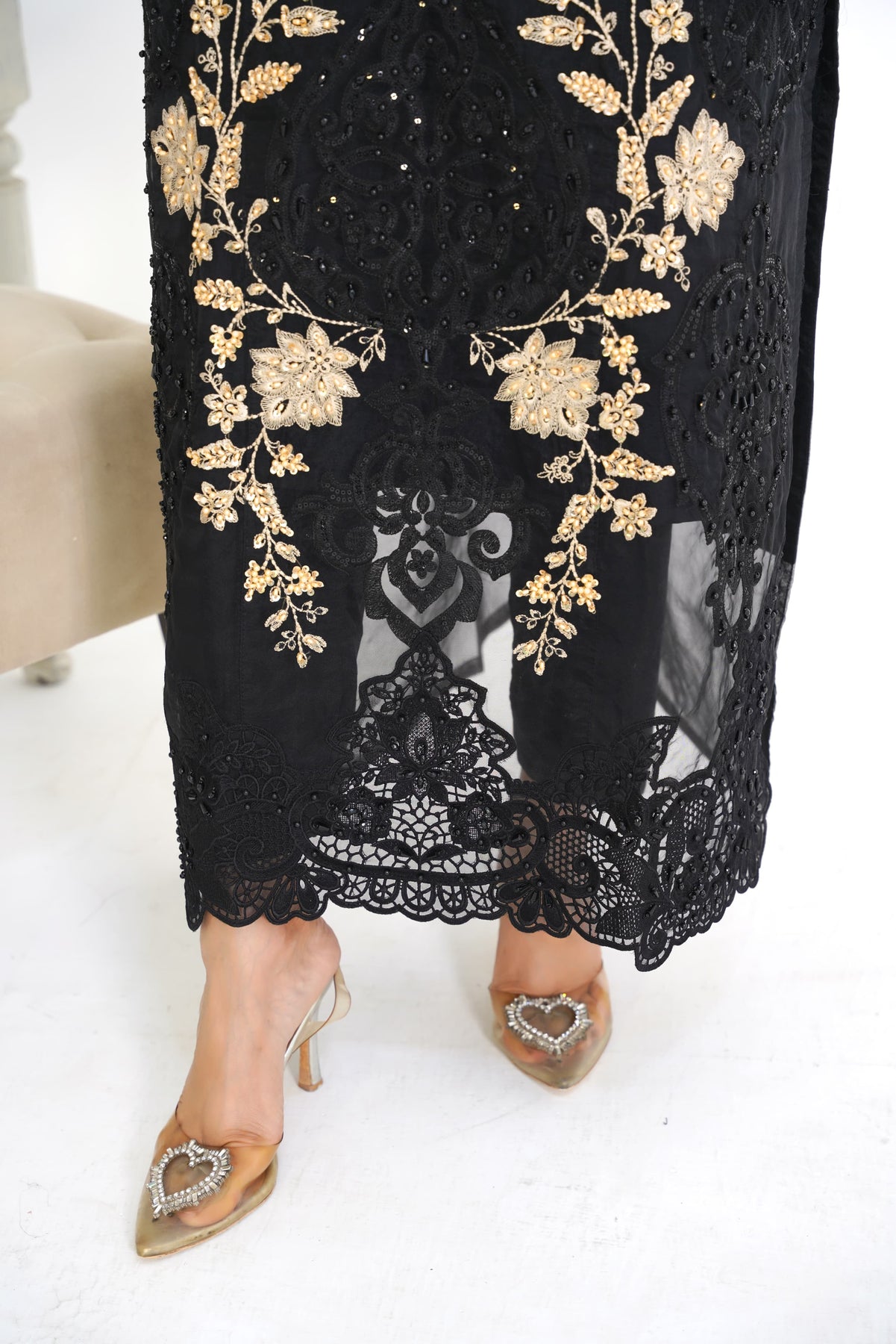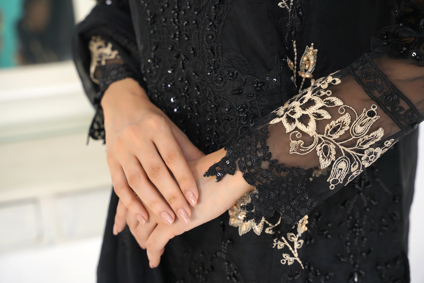 Nain Tara elegant black outfit exudes sophistication with its rich, detailed embroidery and luxurious texture. The long shirt features intricate black handwork paired with striking golden floral motifs that add a touch of glamour. Embroidered sleeves enhance the overall charm, while the matching black dupatta with delicate borders completes the graceful look. Paired with straight trousers, this ensemble is perfect for evening events, festive occasions, or formal gatherings, offering a timeless, classy, and refined appearance.