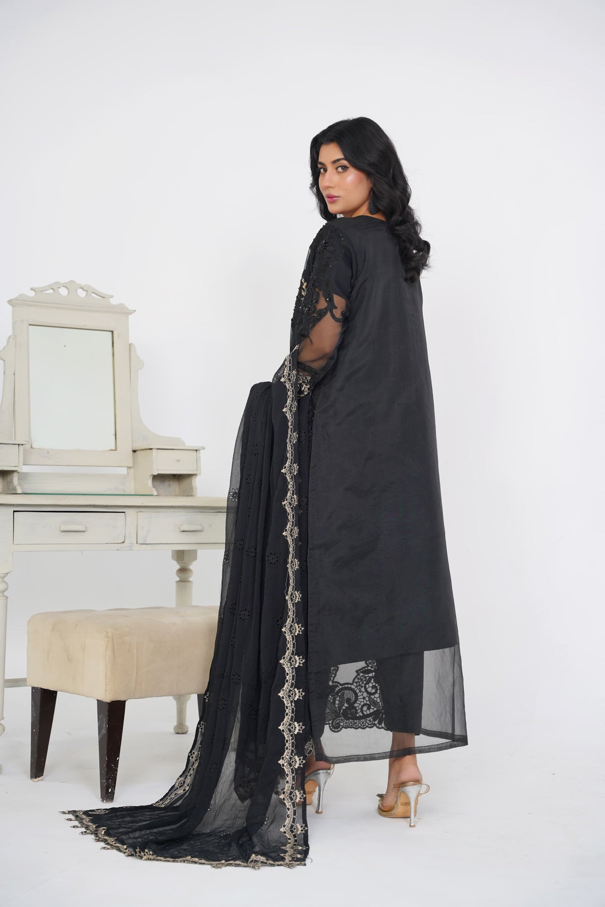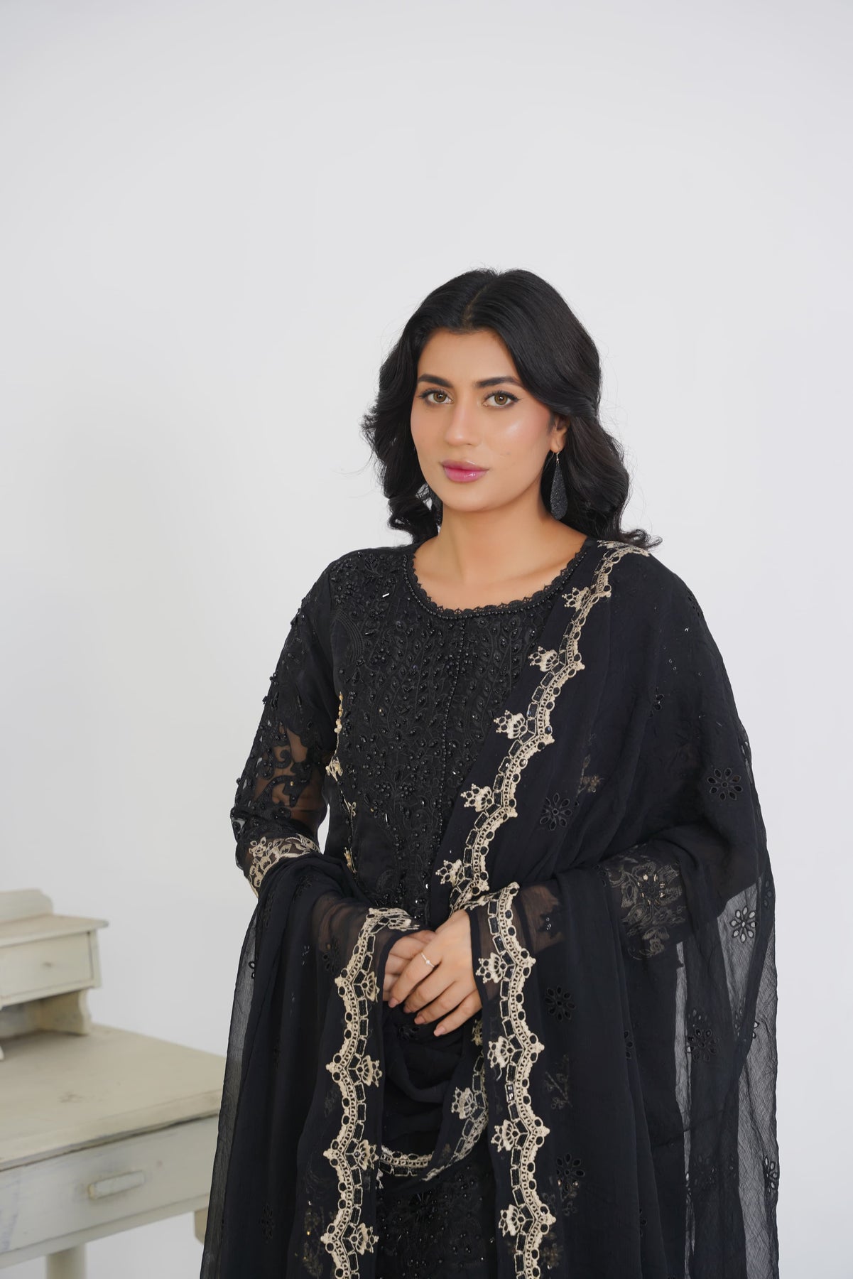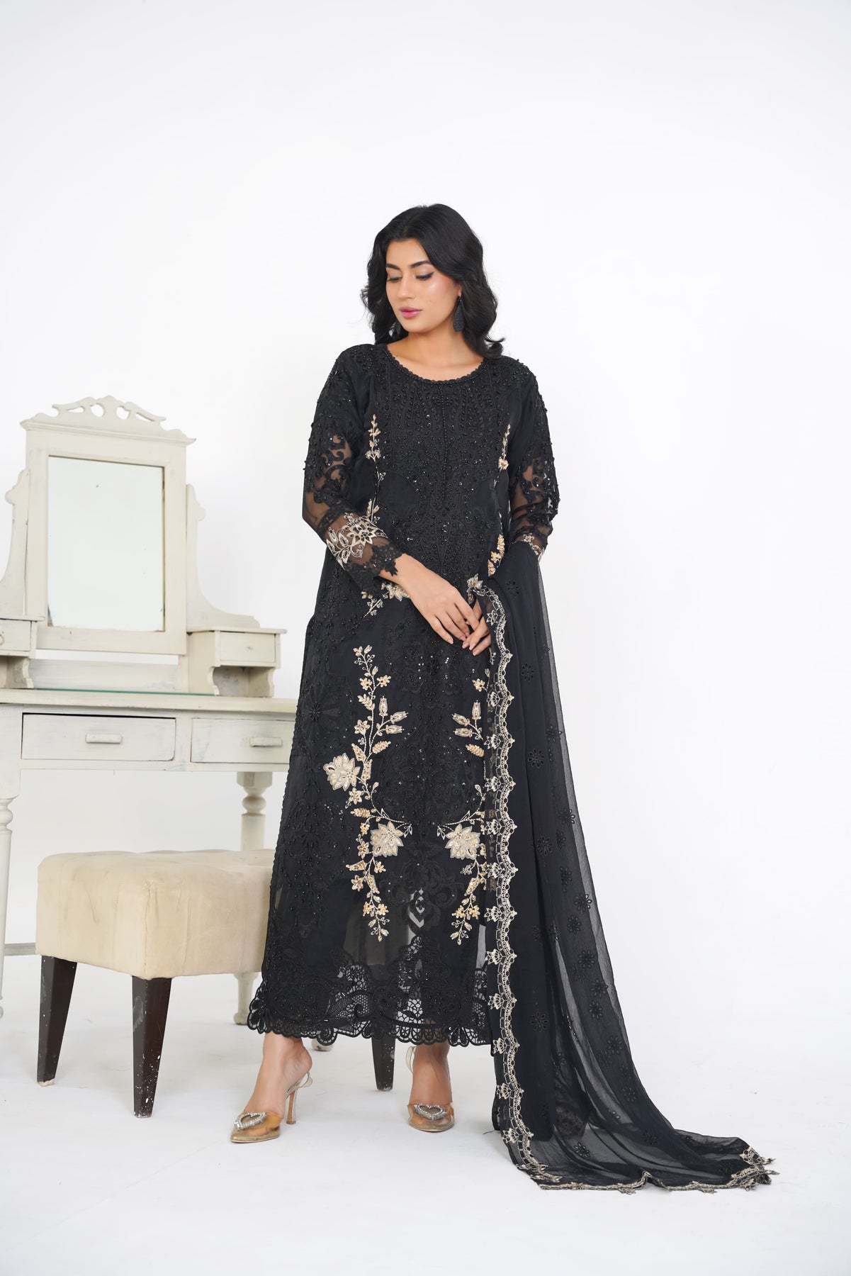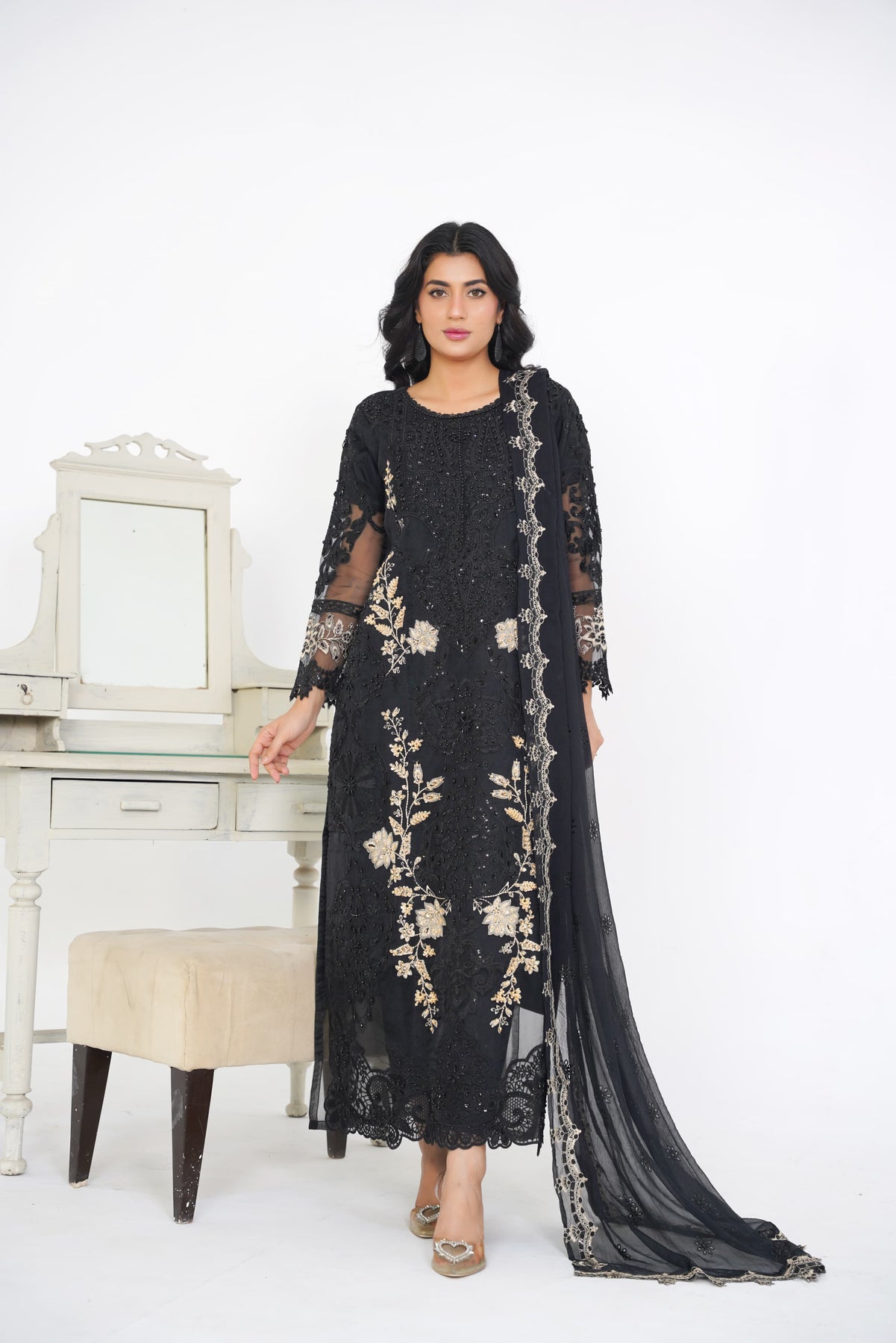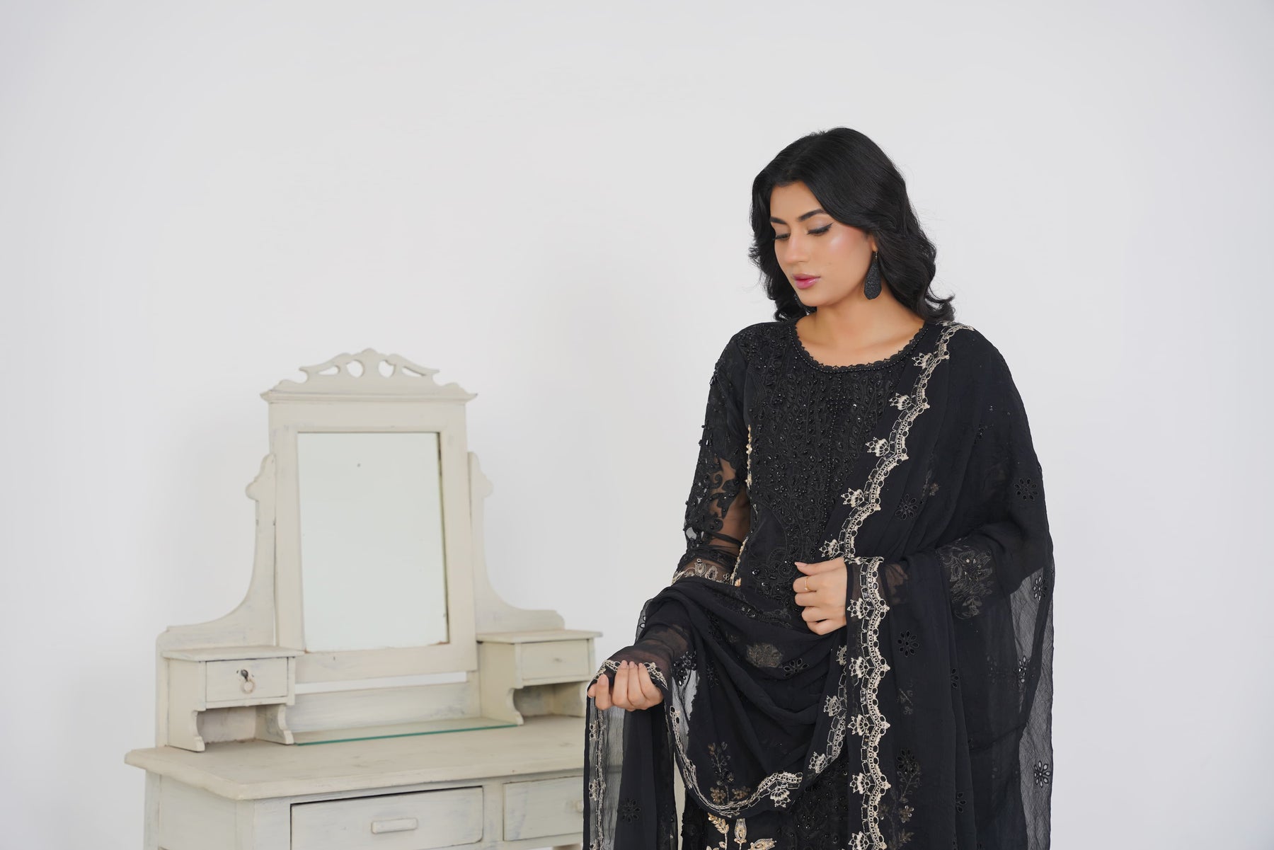 Nain Tara elegant black outfit exudes sophistication with its rich, detailed embroidery and luxurious texture. The long shirt features intricate black handwork paired with striking golden floral motifs that add a touch of glamour. Embroidered sleeves enhance the overall charm, while the matching black dupatta with delicate borders completes the graceful look. Paired with straight trousers, this ensemble is perfect for evening events, festive occasions, or formal gatherings, offering a timeless, classy, and refined appearance.
