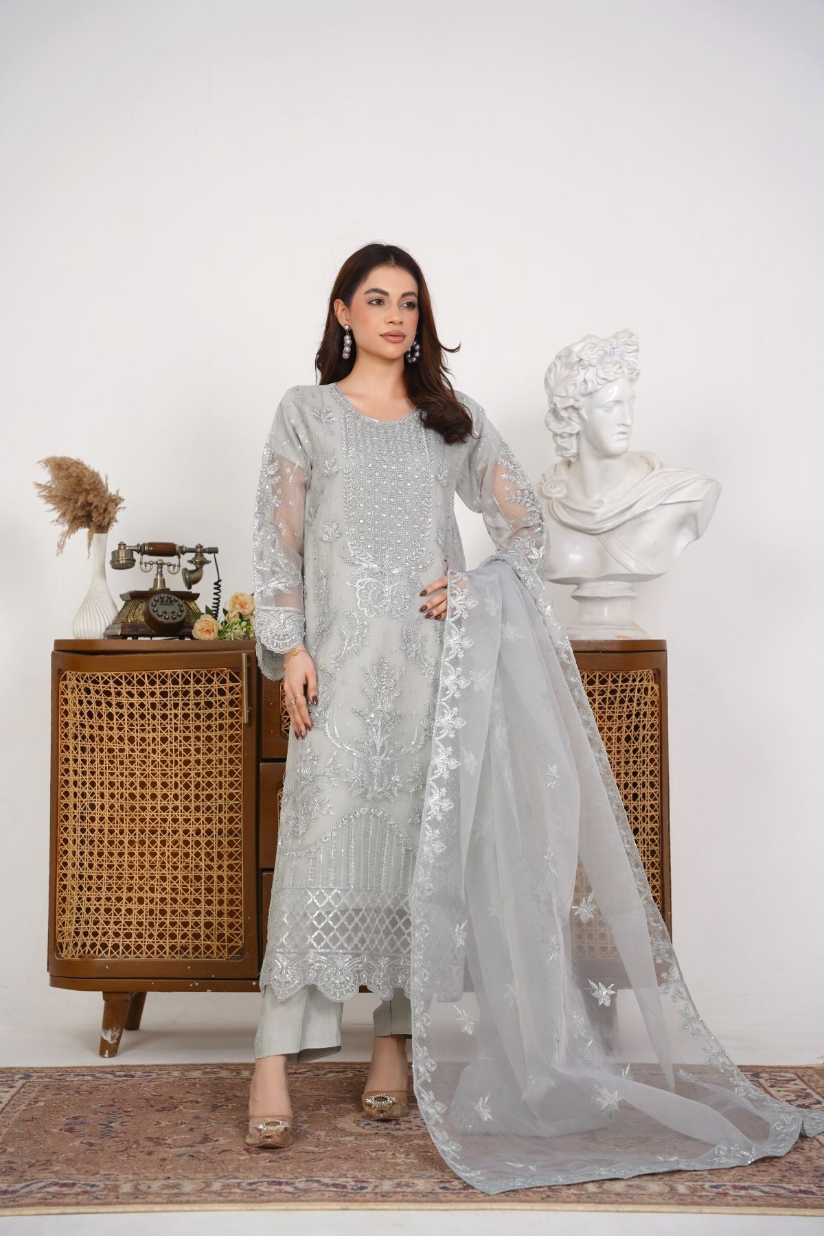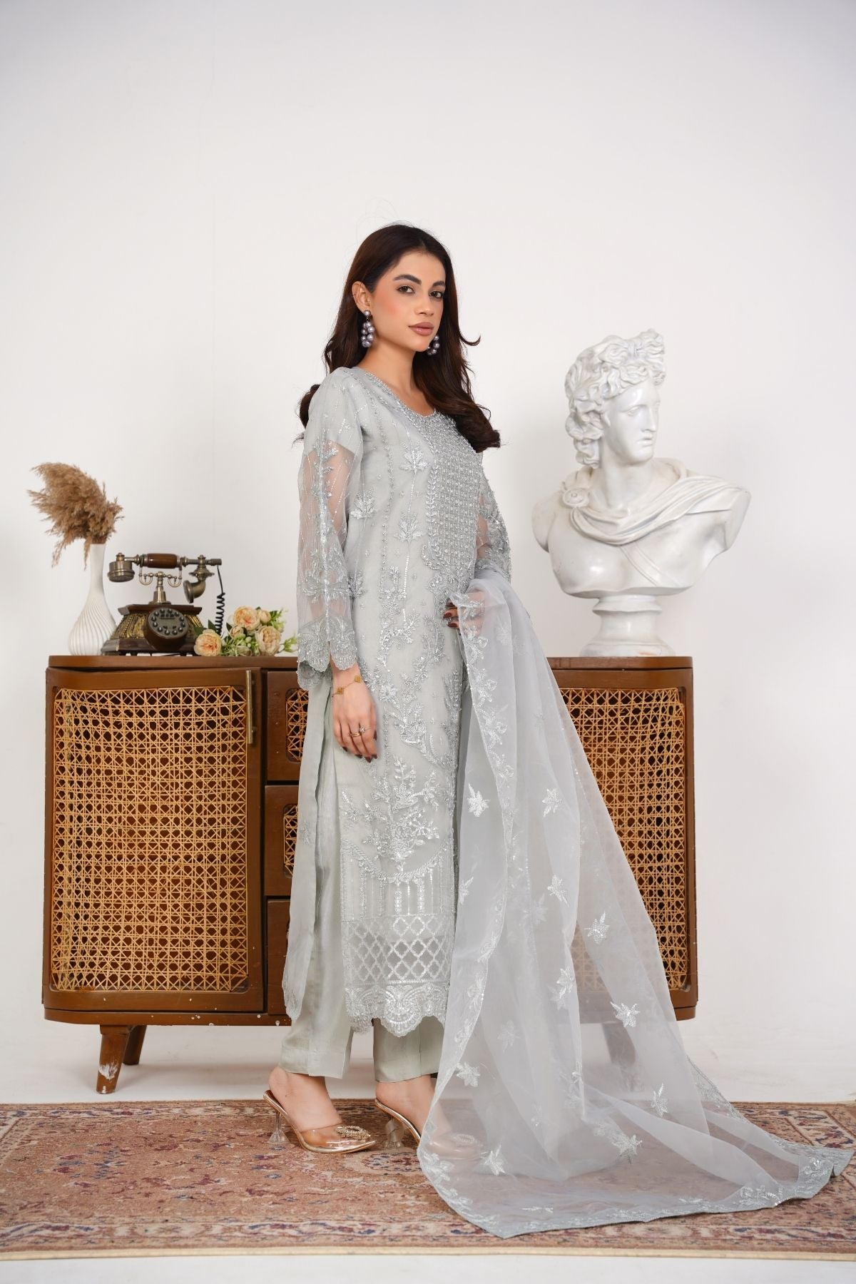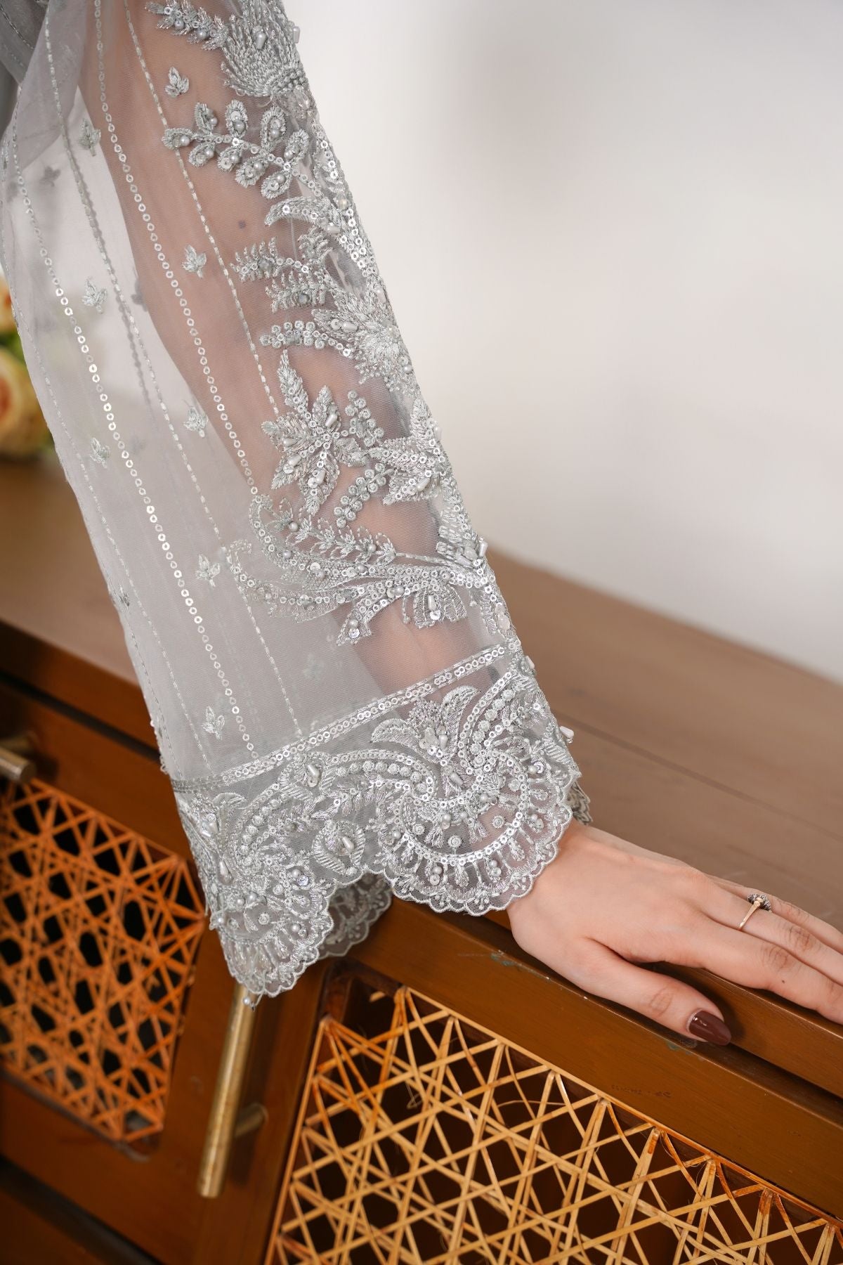 Jan-e-Jahan is rendered in a light  cool grey color giving it an elegant and sophisticated feel.The shirt features intricate embroidery across the front, likely incorporating silver threadwork, sequins, and adda work. The accompanying trousers are simple and tailored, providing a balanced contrast to the heavily embellished top.The dupatta  with delicate embroidered or appliquéd floral motifs along its borders, adding a final touch of grace.